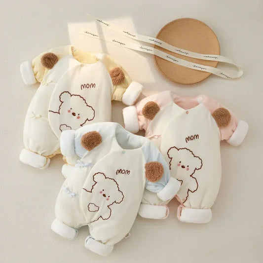 100% Cotton Extra Warm Long Sleeve Quilted Romper - Pink Bear