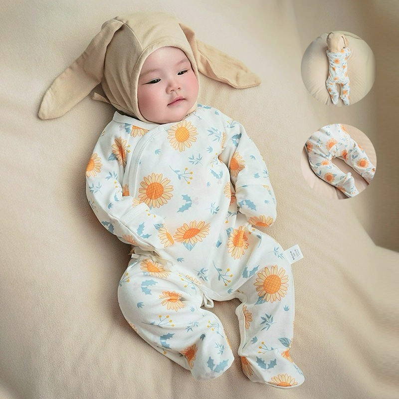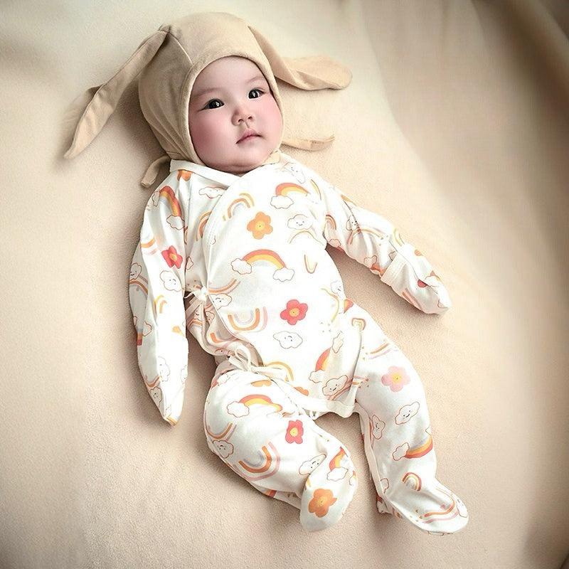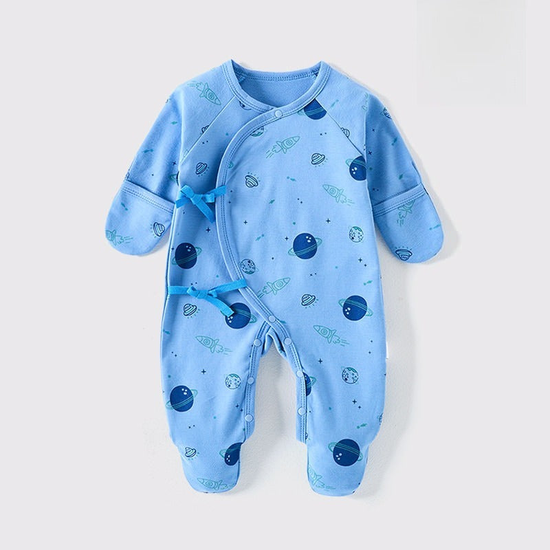 - Baby-footed onesie with mittens safely and warmly protects baby's feet and hands.