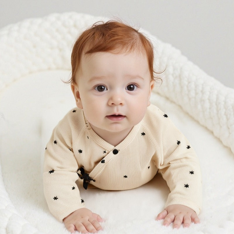 - Kimono / Wrap Style: This style opens completely at the front and is secured with snaps. It's perfect for newborns as you don't have to pull anything over their head or umbilical cord stump. It also allows for easy layering and is ideal for checking on medical devices or monitors.