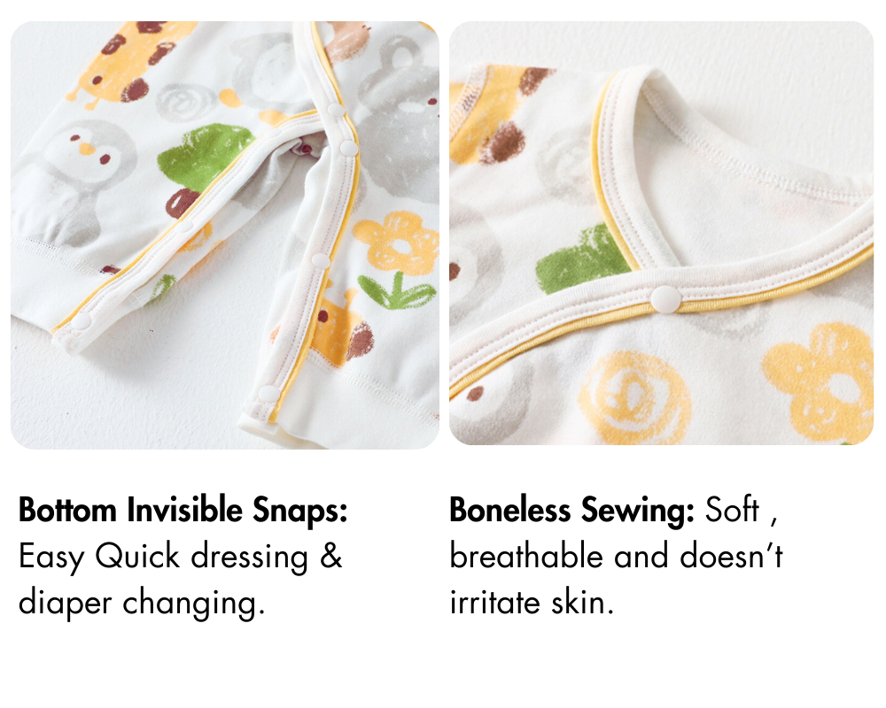 Changing diapers couldn't be simpler thanks to the convenient bottom snaps. You won’t need to fully undress your baby — just unfasten the snaps at the bottom for quick and stress-free changes, whether you’re at home or on the go.