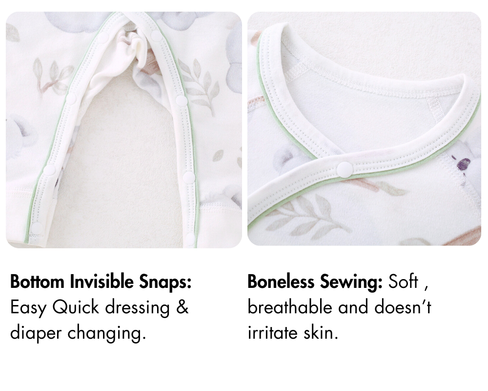 Changing diapers couldn't be simpler thanks to the convenient bottom snaps. You won’t need to fully undress your baby — just unfasten the snaps at the bottom for quick and stress-free changes, whether you’re at home or on the go.