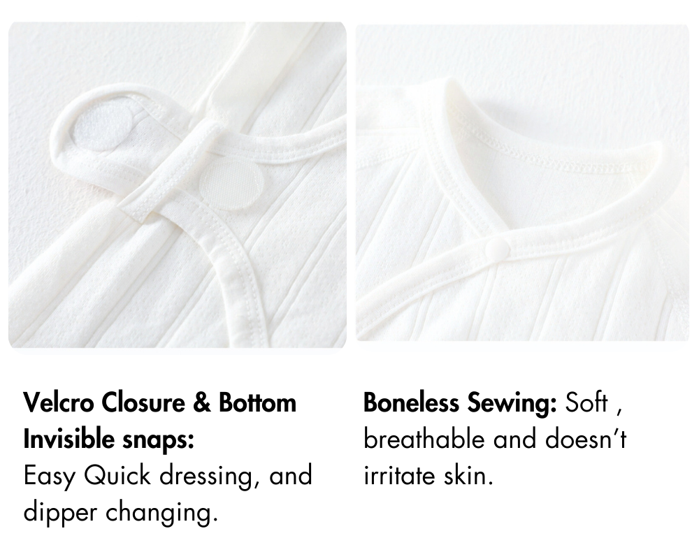 Changing diapers couldn't be simpler thanks to the convenient bottom snaps. You won’t need to fully undress your baby — just unfasten the snaps at the bottom for quick and stress-free changes, whether you’re at home or on the go.