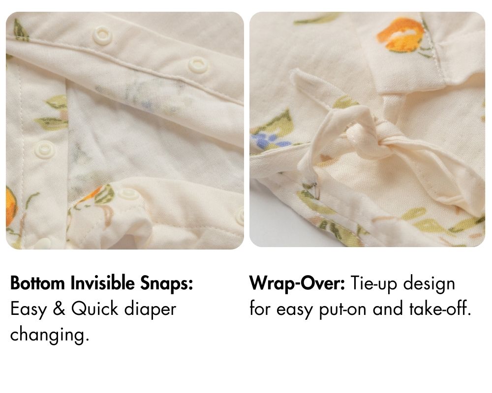 Changing diapers couldn't be simpler thanks to the convenient bottom snaps. You won’t need to fully undress your baby — just unfasten the snaps at the bottom for quick and stress-free changes, whether you’re at home or on the go.