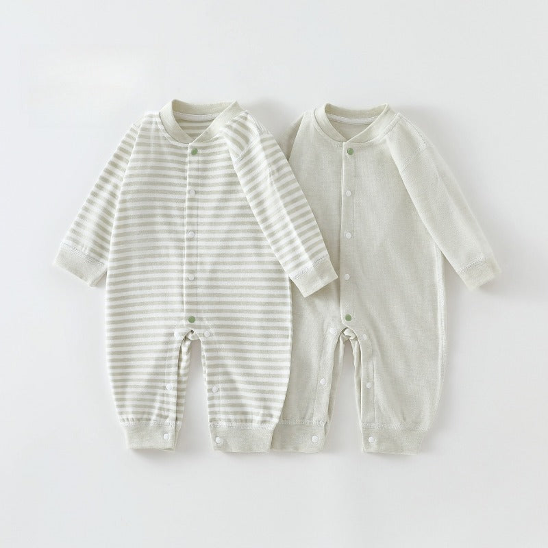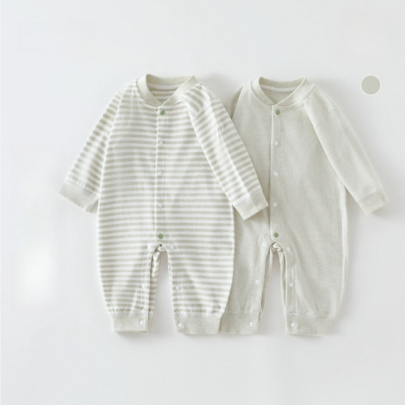 [2-Pieces Set] 100% Cotton Long Sleeve Snapup Romper - Green & Green Stripe