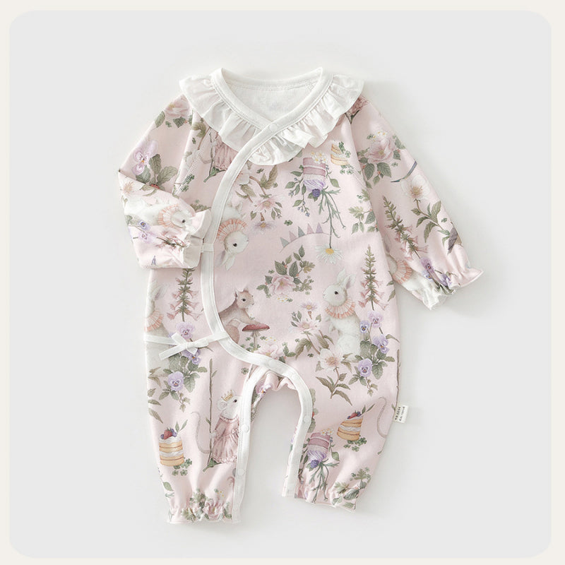 100% Cotton Long Sleeve Snap-Up Romper - Bowknot with Flowers