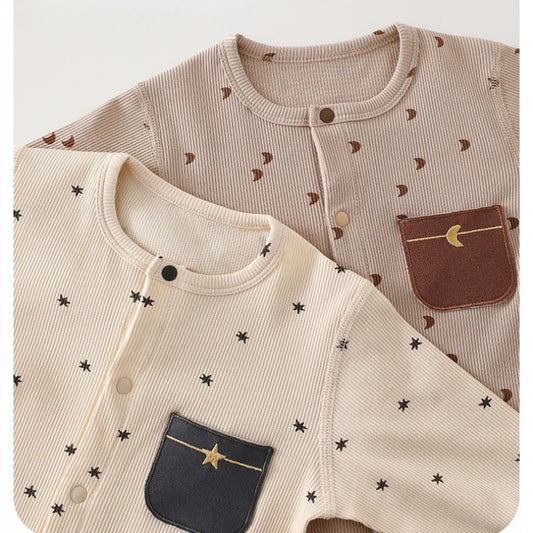 Cotton Snap-Up Long Sleeve Romper - Beige Star