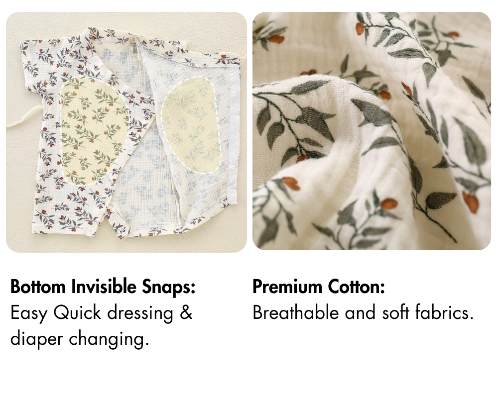 Bodyfeu' baby rompers crafted from breathable 100% cotton muslin, our short-sleeve designs offer comfortable coverage . These unisex baby clothes are a must-have for your children's clothing collection.
